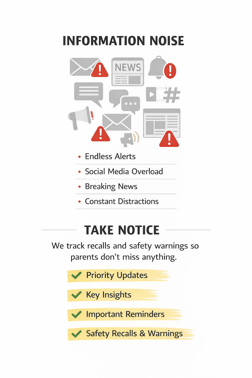 Take Notice is a safety alert service for families.It watches recalls, investigations, and early safety concerns tied to products parents actually use.When something matters, we tell you about it.