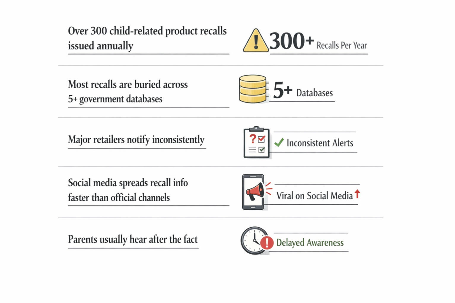 Products families use every day, including:Baby and kid productsToys and clothingCar seats and transportation itemsHousehold productsFood & moreIf a government agency issues a recall, we see it.