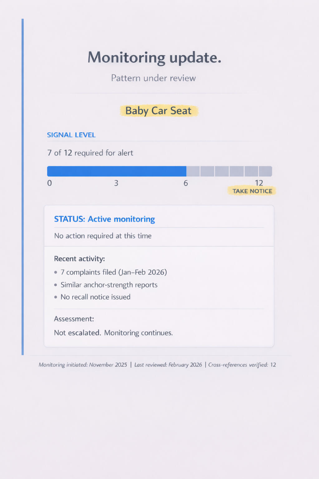 Take Notice is the only service built to watch what happens before a recall.Most products are in homes long before anything becomes official.Complaints build quietly. Patterns form before the public announcement.Take Notice exists for that gap.
